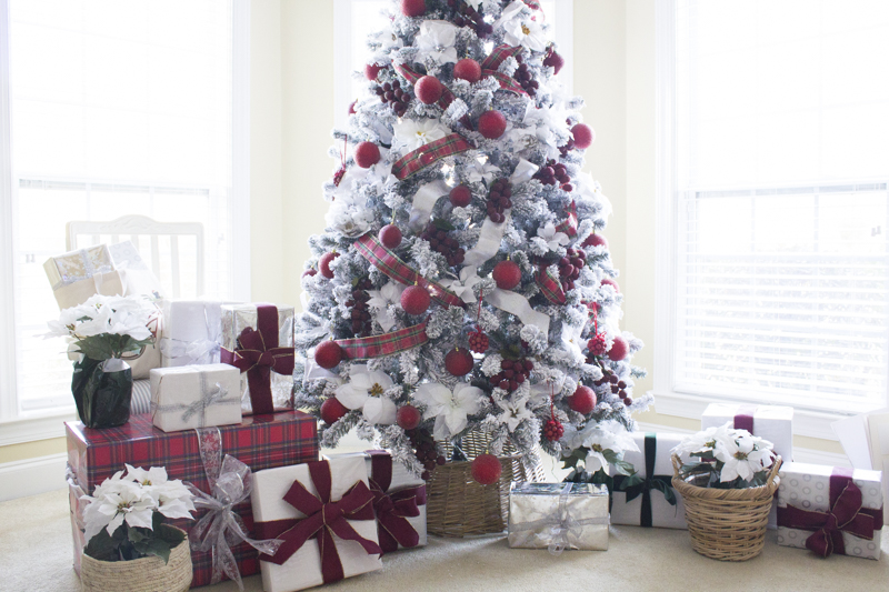 Our main Christmas tree is in the piano room in front of the bay windows. I have the Prince flocked 7 ft tree and it is stupendous. The flocking is beautiful, fluffy and overall, amazing quality. I had this one in the family room last Christmas but King of Christmas sent me a skinny tree this year so I’ll be sharing that tree on Friday.