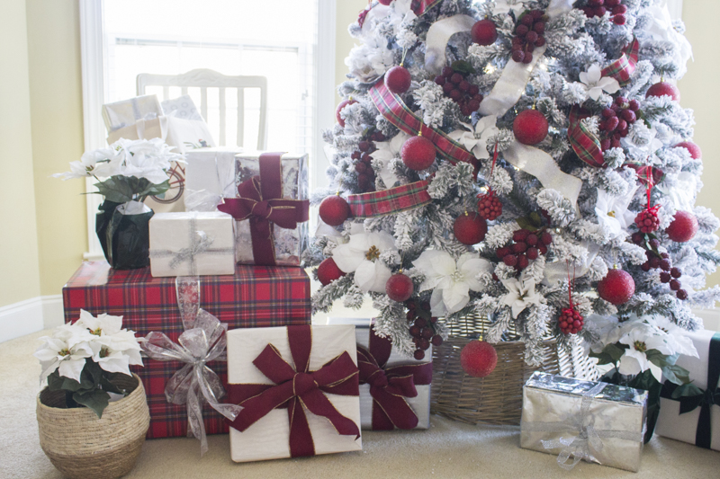Since classic never goes out of style, I used traditional colors to decorate our main tree. Classic red and burgundy come together with splashes of metallic ribbon to create this traditional look with a slight modern twist.
