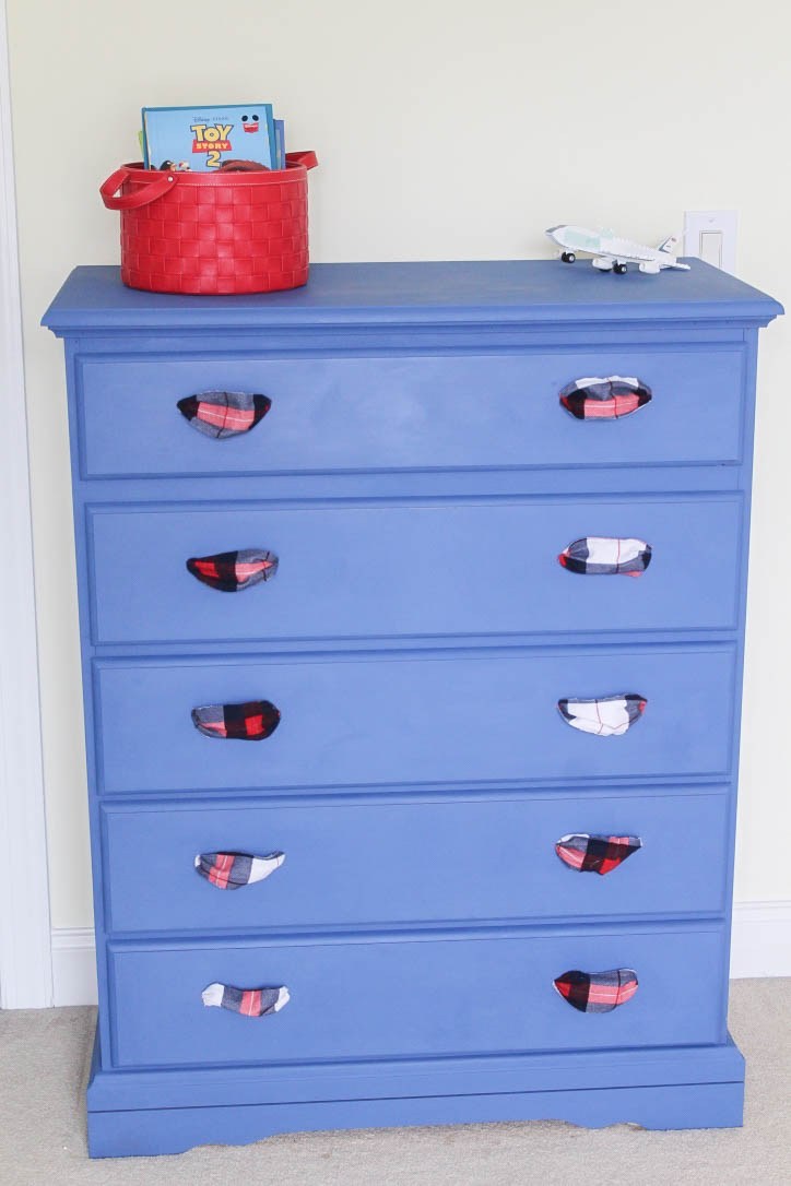 When I painted it blue for JJ’s room, I took out the new handles and used fabric as pulls. I’m laughing at it now but hey, I only had $100 to use for that challenge. It’s a little cheesy but it was cute and it lasted a long while. I used blue chalk paint so I didn’t do any sanding then.