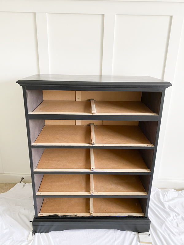 Okay, let’s get to how I gave it a completely new look just using two products. First, I put down a large cloth to protect the rug and carpet. Aren’t you proud of me for doing that?! Ha! I also removed all the drawers and decided to paint those on the patio.