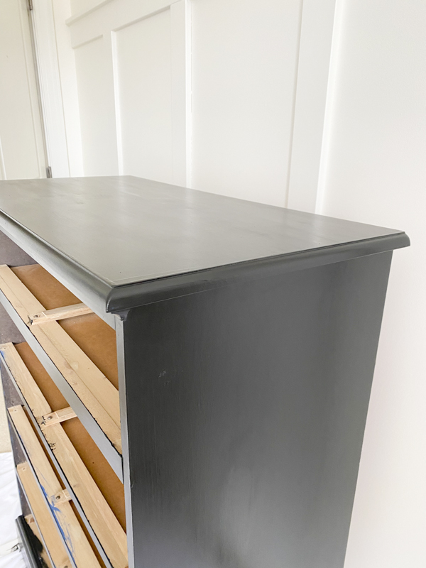 I didn’t sand this time around either because the dresser still had the blue chalk paint on it. When you’re painting a glossy piece of furniture, it’s always a good idea to sand if you’re using latex paint. Sanding isn’t necessary for chalk paint or even Velvet Finishes paint.
