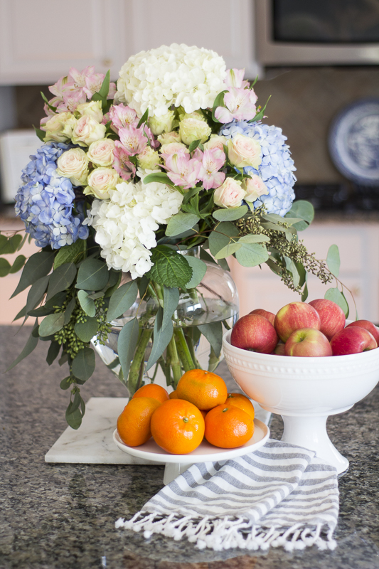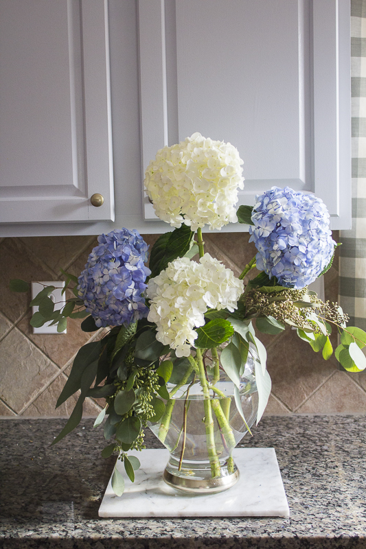 My in laws owned and operated their own flower shop for many years. In those years, I managed to pick up a few tips since I helped them during all of the busy holidays. My MIL taught me how to prolong the life of hydrangeas and I learned how to create arrangements by watching the designers put together all sorts of orders. If you’ve ever wanted to create a floral arrangement but didn’t know where to start, here are some simple steps to help you! *Disclaimer: I’m by no means an a floral expert but this is just how I do it!