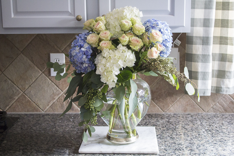 Step 4: Add filler flowers like spray roses like I did below. I made sure nothing was placed higher than my tallest hydrangea. You could also use irises, alstroemeria, stock, carnations, daises etc. These flowers help to fill in the gaps in the arrangement. The choices are endless! This is also a great way to add color from varieties of flowers. Doesn’t that look so much better?