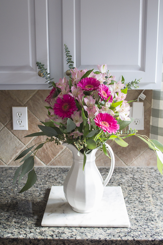 What do you think? I love the hanging foliage on the side and the pretty pastel colors remind me that Spring is near! Btw, all of these flowers were bought from the grocery store. You can buy great quality flowers from your local store and make them look like an expensive arrangement.