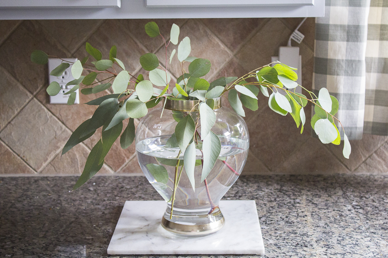 Step 2: Add foliage or leatherleaf as your greenery. Here, I used eucalyptus I bought from Trader Joes. Each bundle is only $2.99 and lasts a long time.