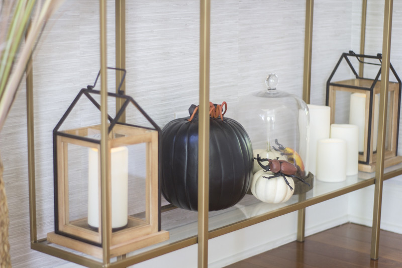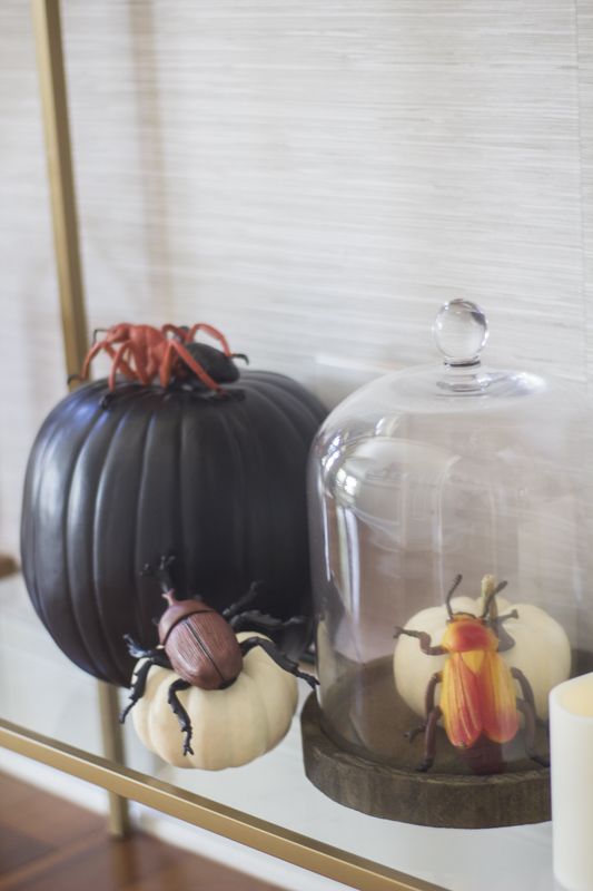 The glass cloche comes in two sizes and are great for holding all the creepy things like these gigantic spiders and bugs. I love using battery lit candles during the holidays and they add the perfect mood to any vignette. The iron and wood lanterns are also great for holding the battery powered candles.