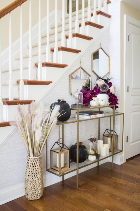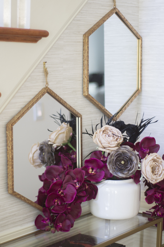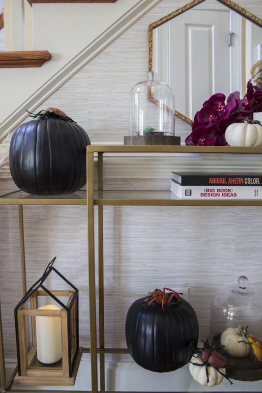 I just adore this wallpaper and it really adds a layer of sophistication to this wall. These hexagonal mirrors are also from Joann and were the perfect size paired together. The antique gold distressing on the mirrors give them nice character and sheen. I also added some faux black pumpkins and a bunch of faux spiders that my kids absolutely love.