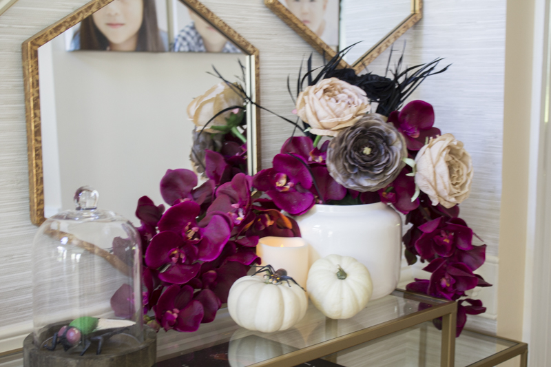 I put together a simple moody faux floral arrangement using a low vase. I love how the fake orchids drape out on the sides creating a more modern and dramatic look.