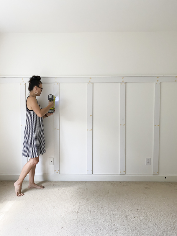 Back to the grind! Wall treatments add so much dimension and visual interest to any space. Yes, you can wear a dress and DIY. Do what you want! If you missed last week’s post, I shared all the details for this board and batten wall treatment including the size boards.