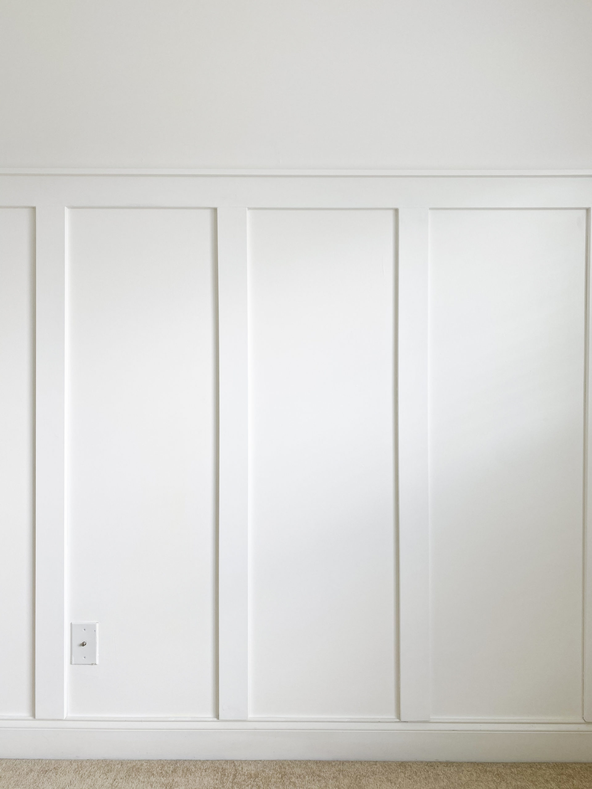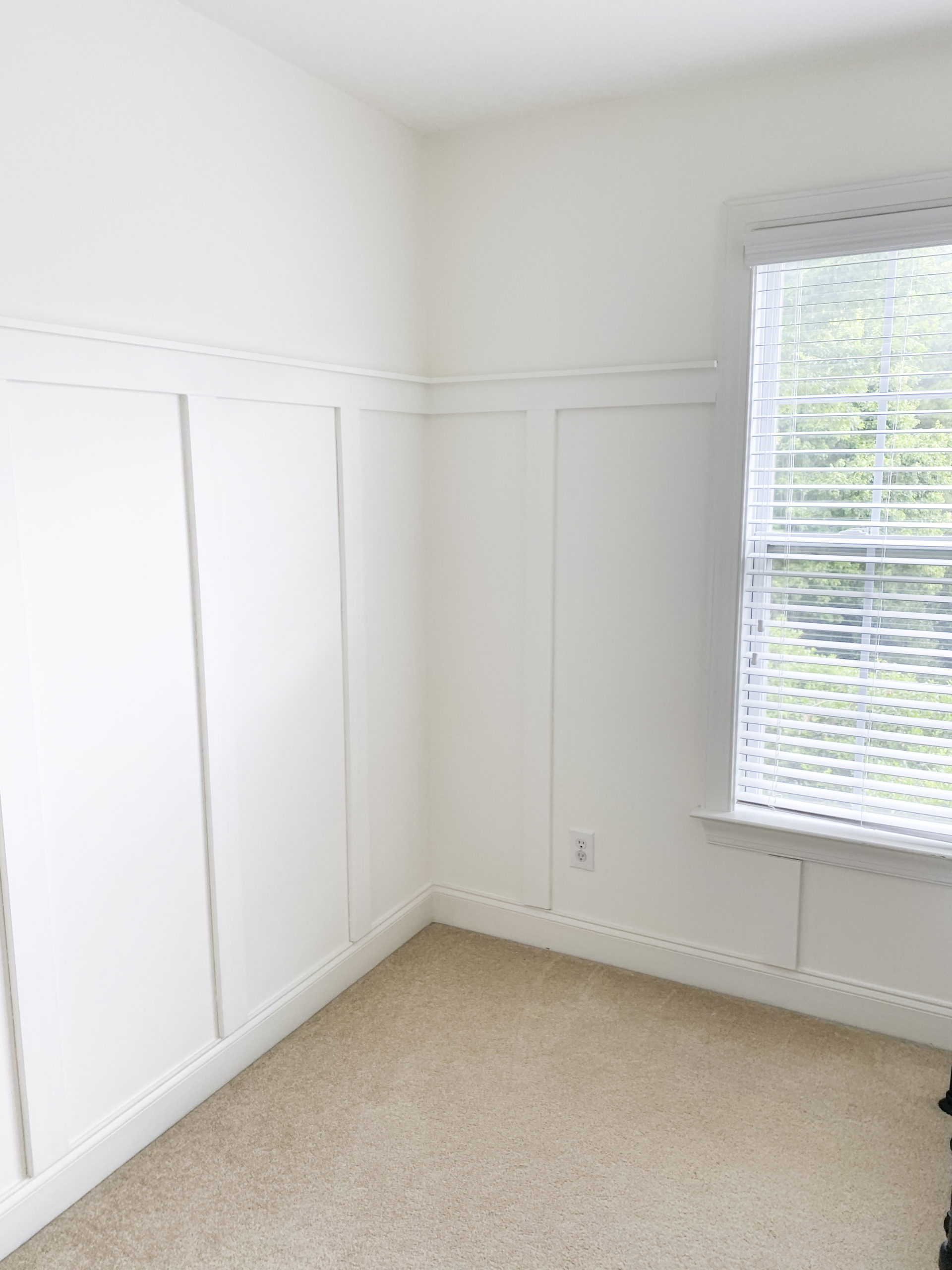 I was asked what we did with the baseboards since it has a curved detail at the top. Normally if the edges of the baseboards and the boards from the wall treatment don’t line up, you have to replace the baseboards all together. In this case, since I was keeping everything the same color, you can’t really see the edges as much.
