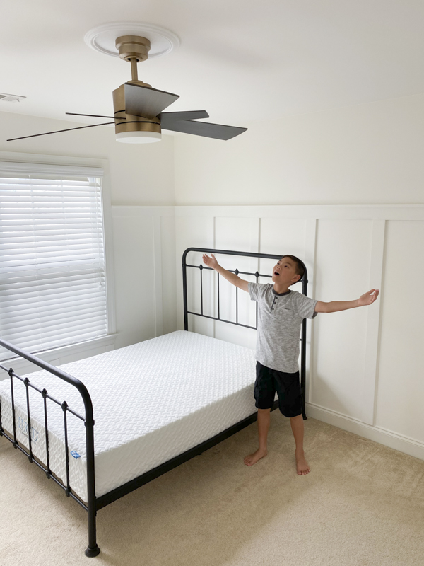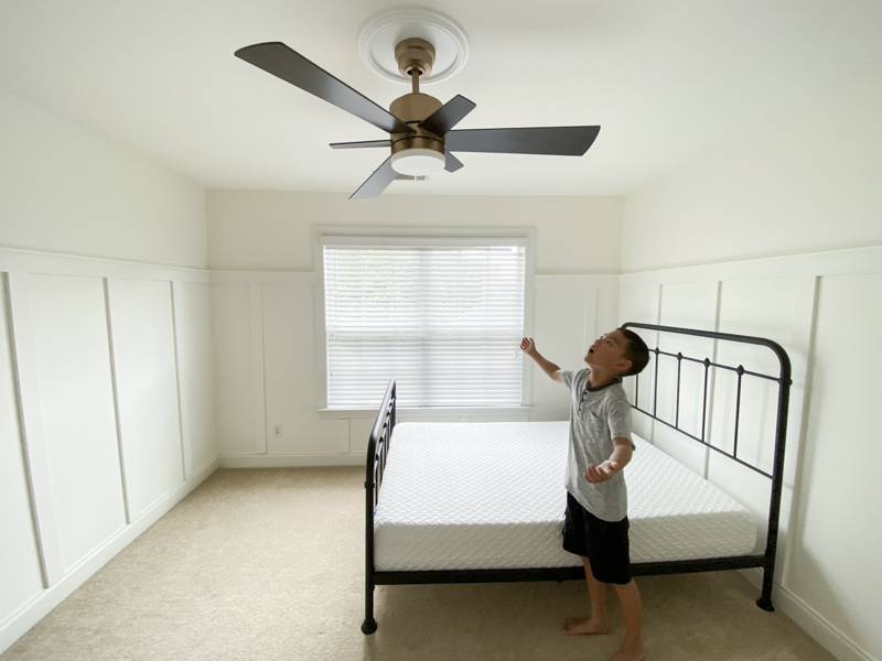 The fan is from Home Depot and I didn’t realize the blades had a mix of two different lengths. I actually think it looks pretty cool! Thanks to my awesome husband for installing this beauty. We also love that it uses an LED light. The design is super slick and I know JJ will use this so much when he turns into a sweaty teenager. Actually he’s already such a sweaty boy.