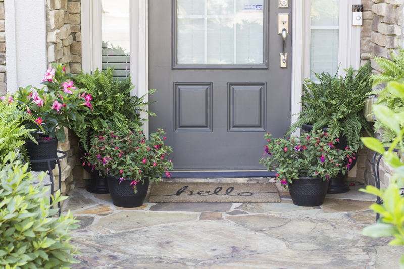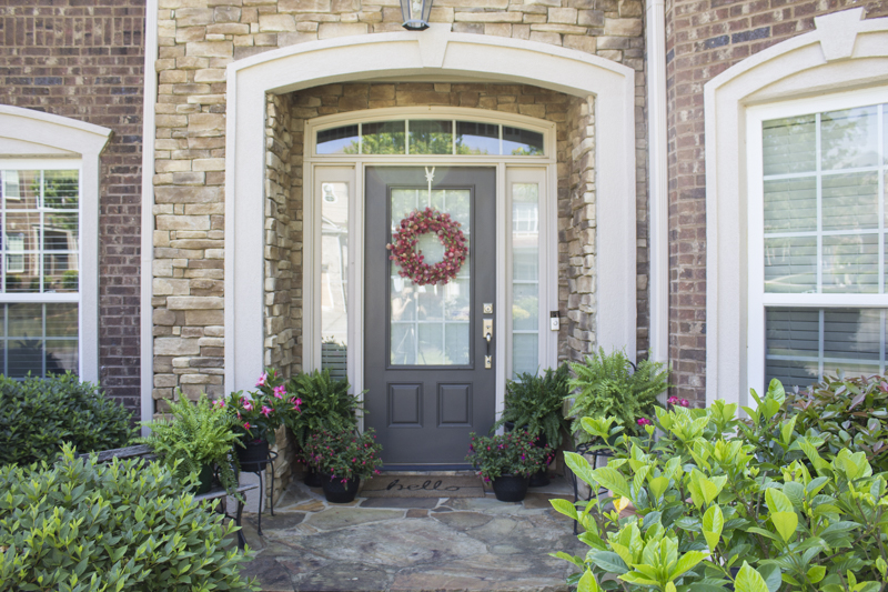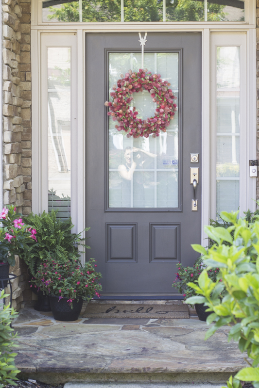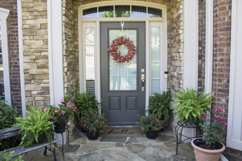 One of the best ways to increase curb appeal to your home is to add a few plants to your front door. It looks inviting and creates a welcoming entrance to everyone who enters your home. Try adding a simple wreath and welcome mat. I love how my wreath adds a nice colorful pop of pink.