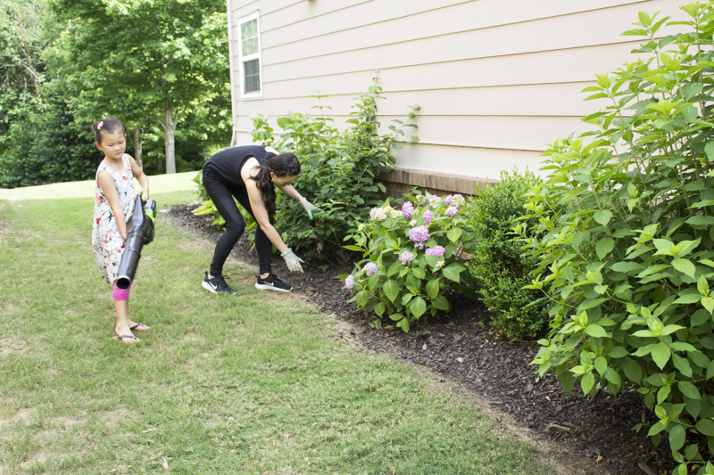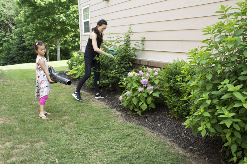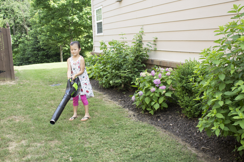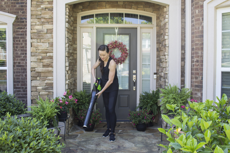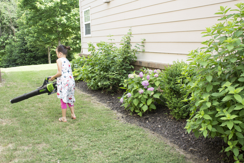 At the end of these tips, it’s time to blow away any extra pieces of mulch or dirt. This 60 volt Greenworks blower is awesome! Again, it’s battery operated and even my youngest can use it and she does!