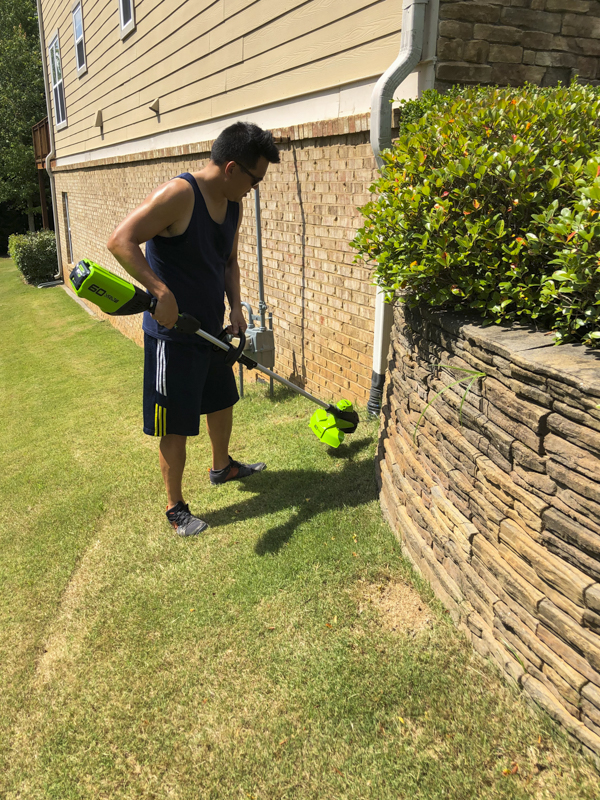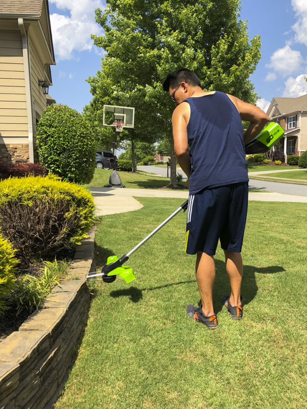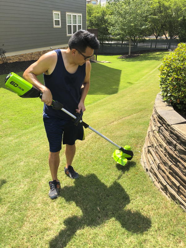 This really helps clean up all the areas outside your home. I think this step elevates the appearance of our yard so much! Plus, it’s super easy to use this 60 volt string trimmer. I recommend using protective eye wear when using this tool since objects like rocks can fly through the air. I love that GreenWorks tools are all battery operated. They make it so easy to use with it’s high efficiency brushless motor.