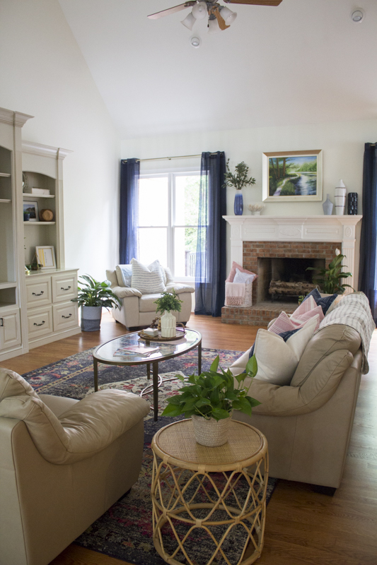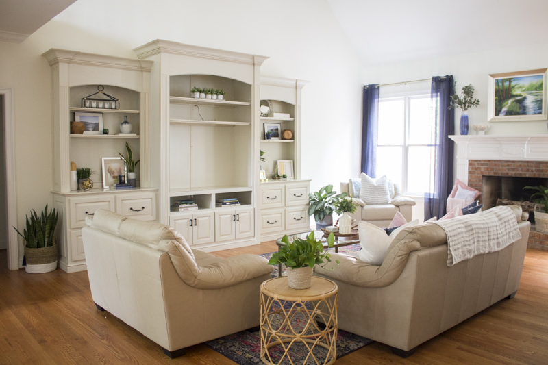 Just painting and removing the heavy boxes made a world of a difference. They kept their original cream colored leather couches so I sourced a new rug, throw pillows, coffee table and other decorative items.