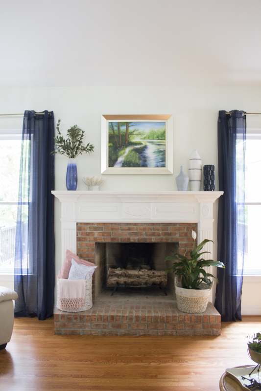 The beautiful painting above the mantel was done by the owner’s mother. It holds sentimental value and it was the main piece that I used to come up with the overall color palette for this space. The use of blues throughout the room adds a nice punch of color but it also invokes a calm vibe. They have two small active girls so peaceful vibes are always welcomed.