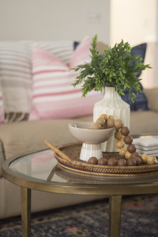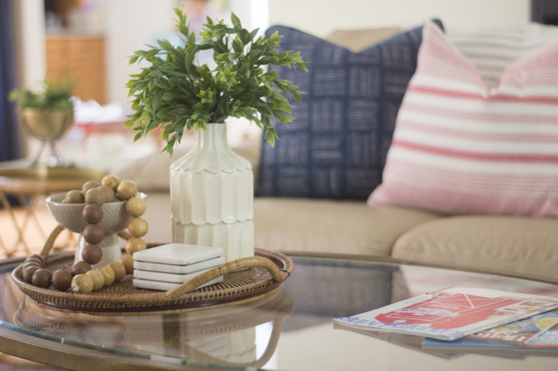 A basket holds extra pillows and a blanket. I always have extra throws in my family room because we are always snuggling up with them on the couch. I added some faux greenery in the tall vase. If you can’t use real, always opt for plants that look as authentic as possible.