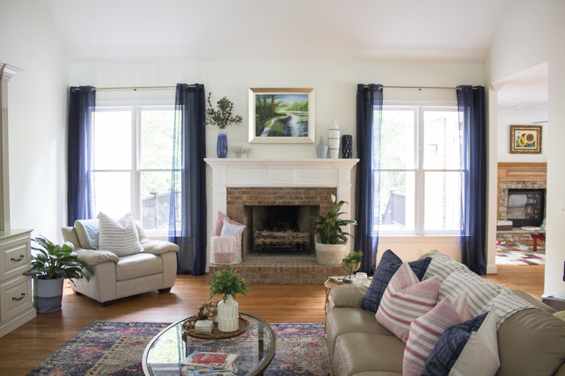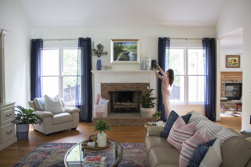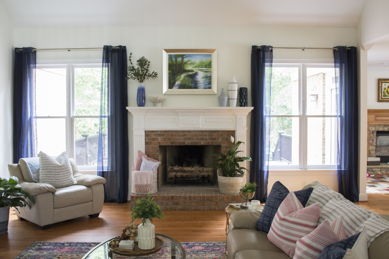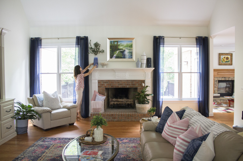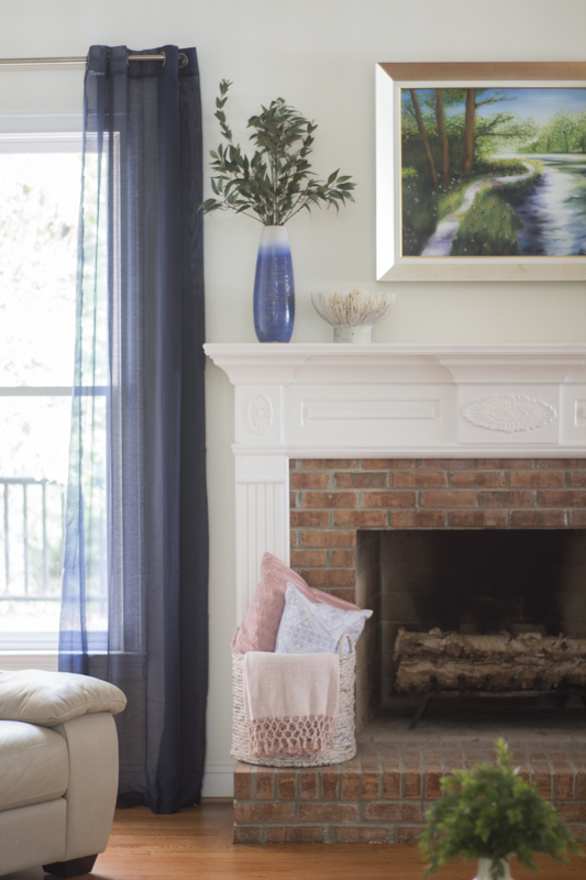 Now you can see just large that mantel is in comparison to me. It’s actually quite large and creates a natural focal point in the room. The sheer navy curtains add color and are so much lighter than the previous maroon drapes.