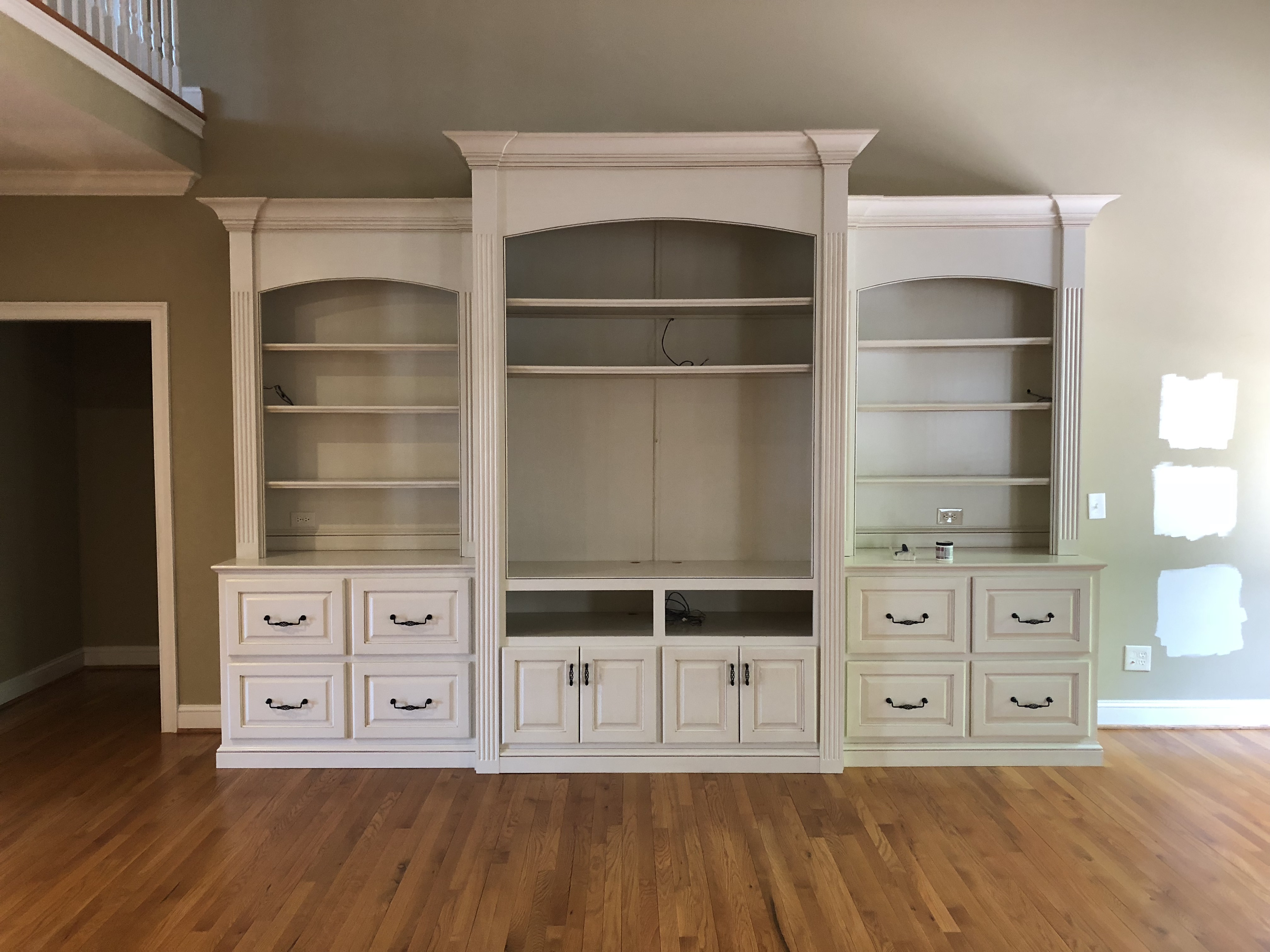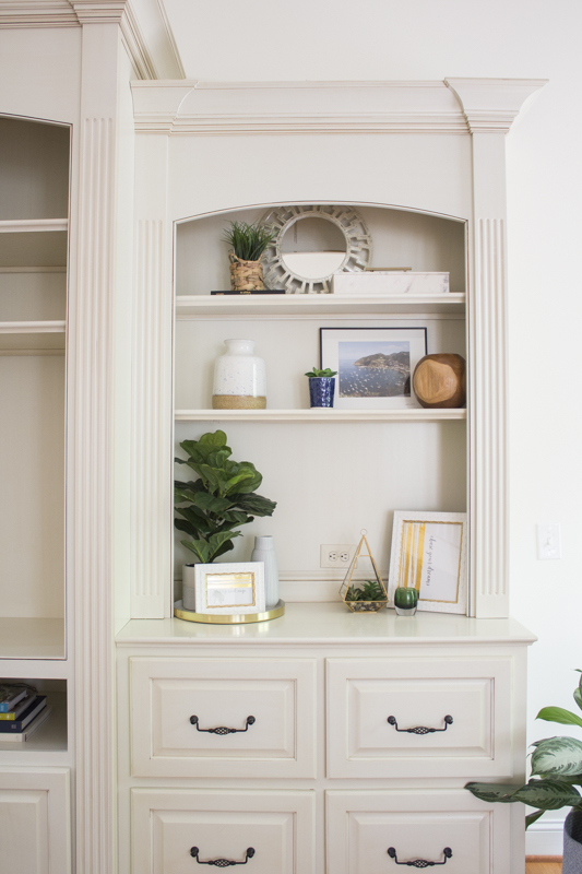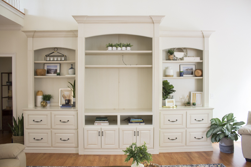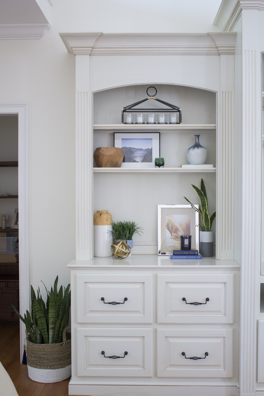 I styled the shelves with decor and photographs that Maggie and Bernie already had. The center was left empty for a television.
