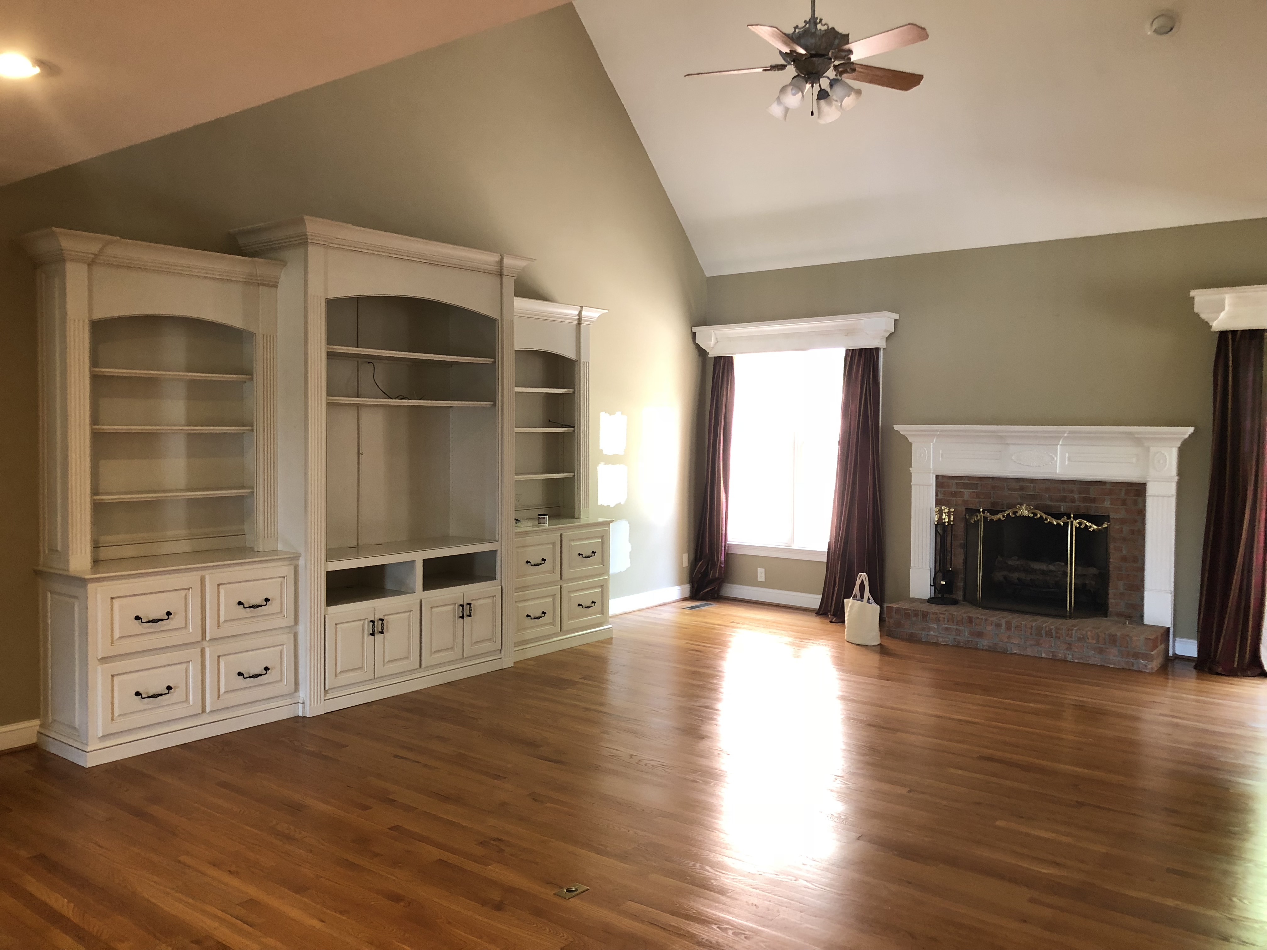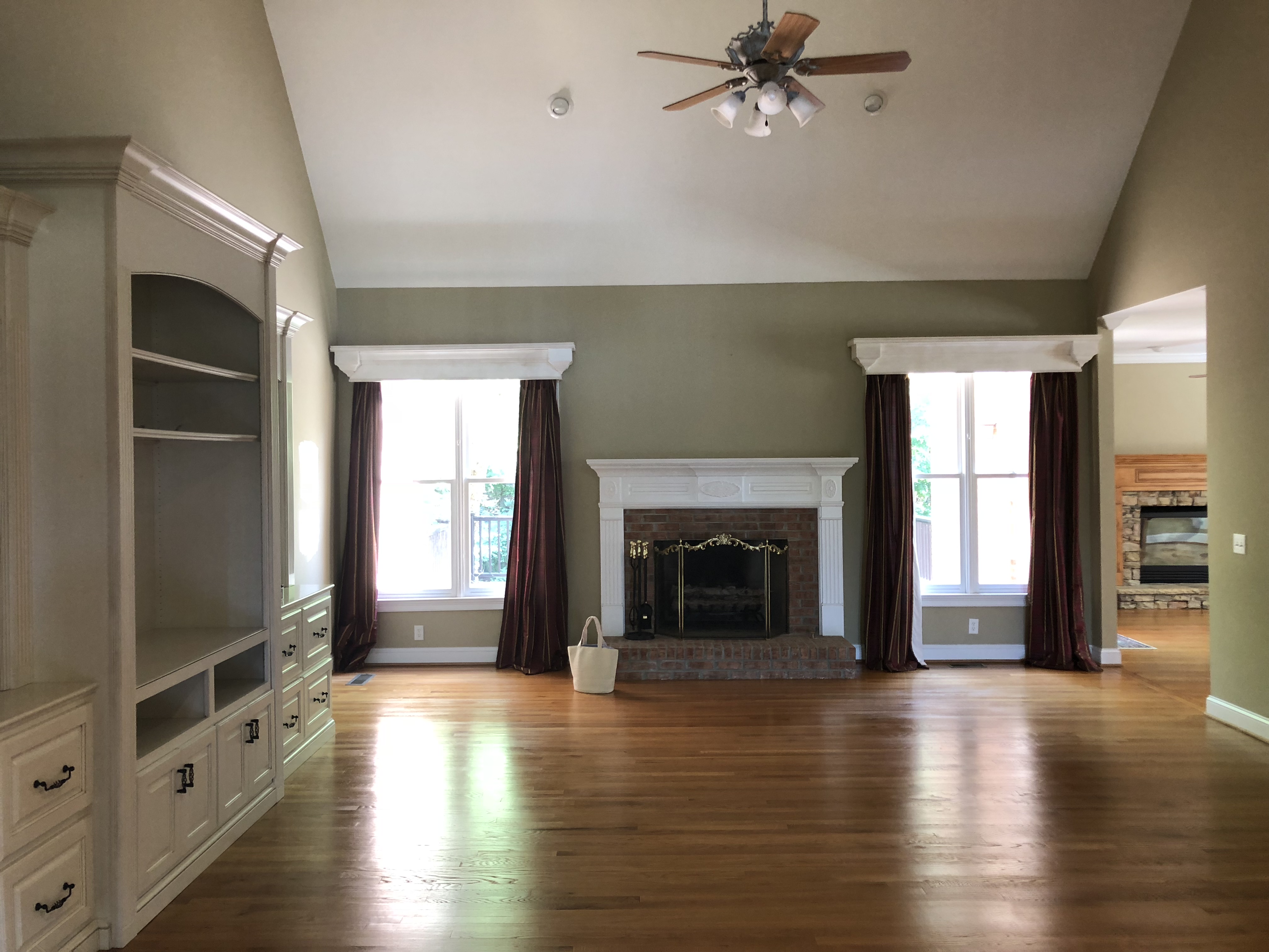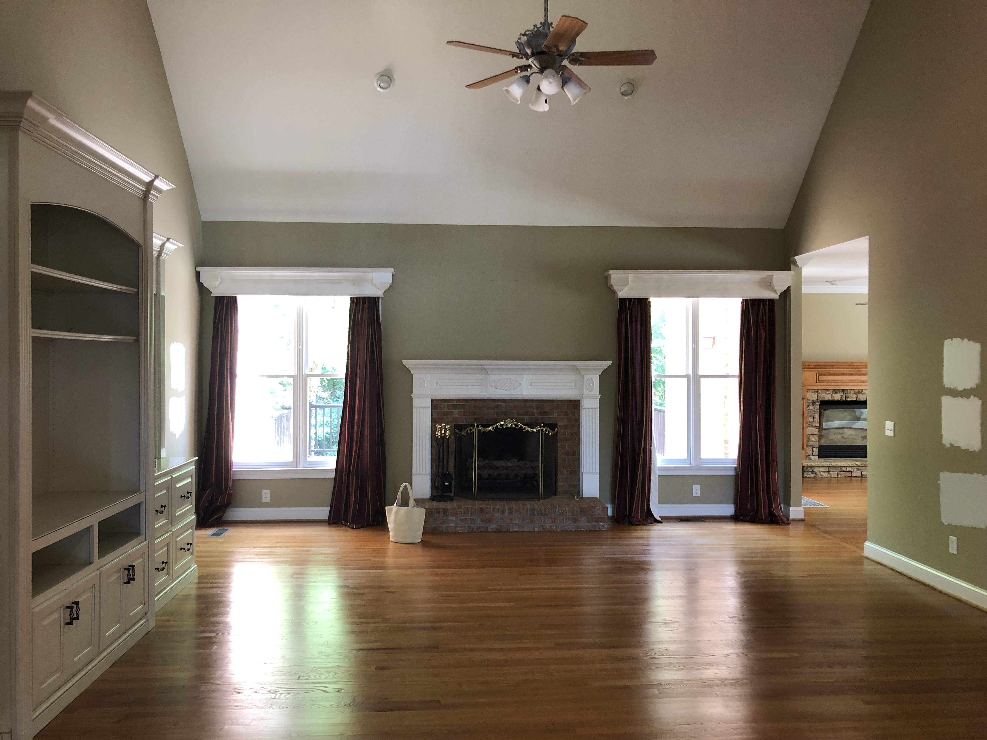 The previous color was a greenish beige color. Combined with the flooring, the color on the walls made the entire room look and feel dark and outdated. I recommended going white and also removing the valence boxes above the windows. The valence boxes with the maroon drapes overwhelmed the windows. The ceiling is high but again, the boxes made the room feel small and tired .