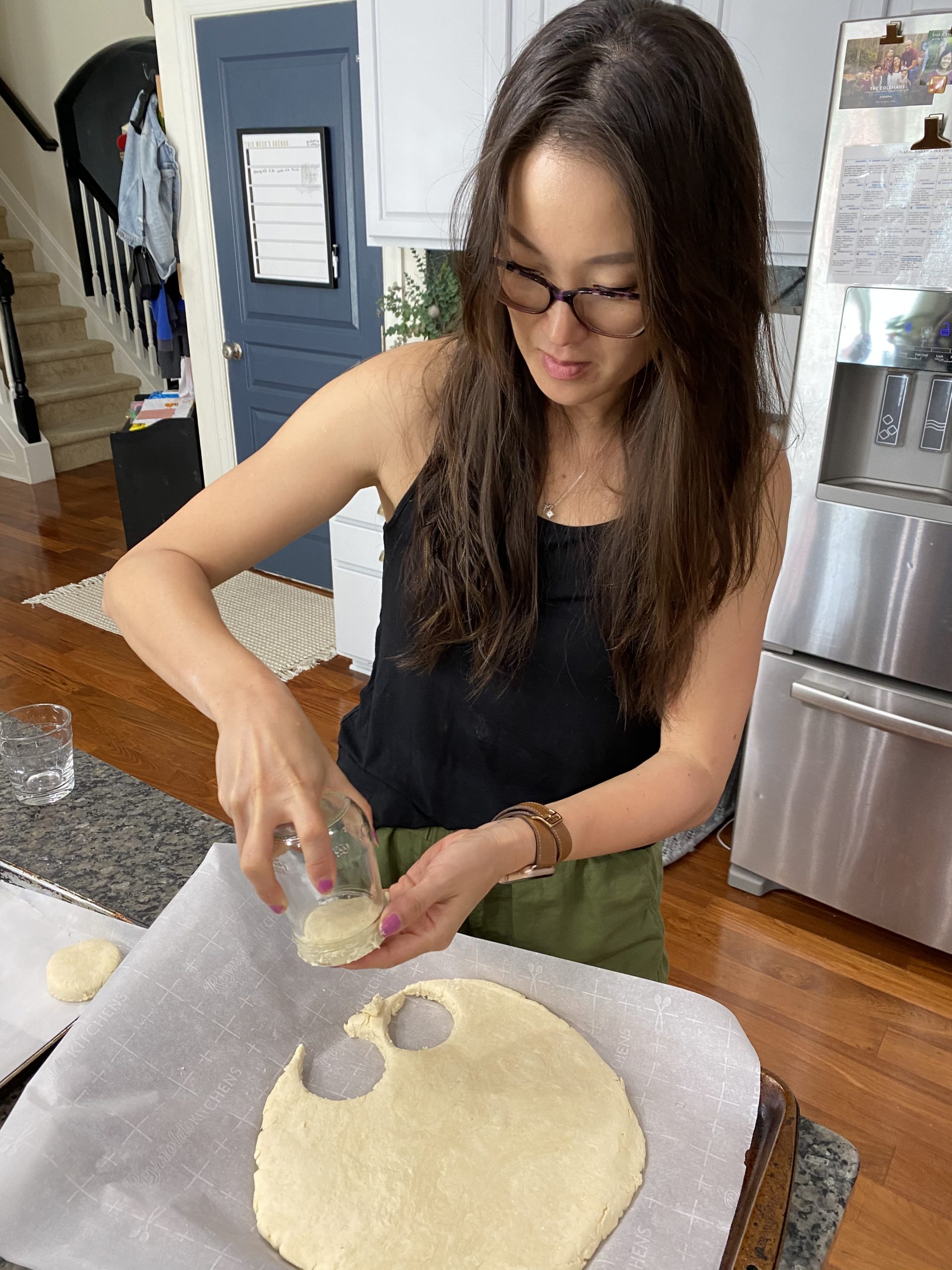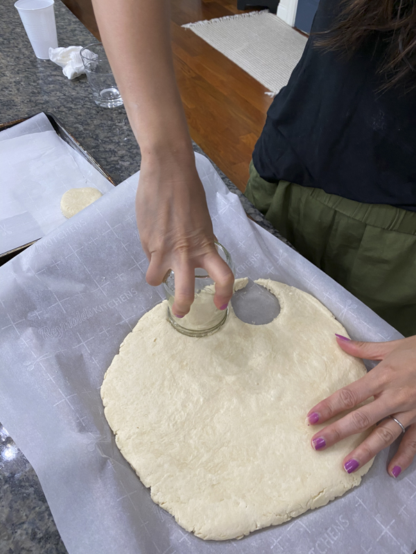Take a biscuit cutter or mason jar like me since I don’t have one. Cut the biscuits as close together and push down and then back up without twisting.