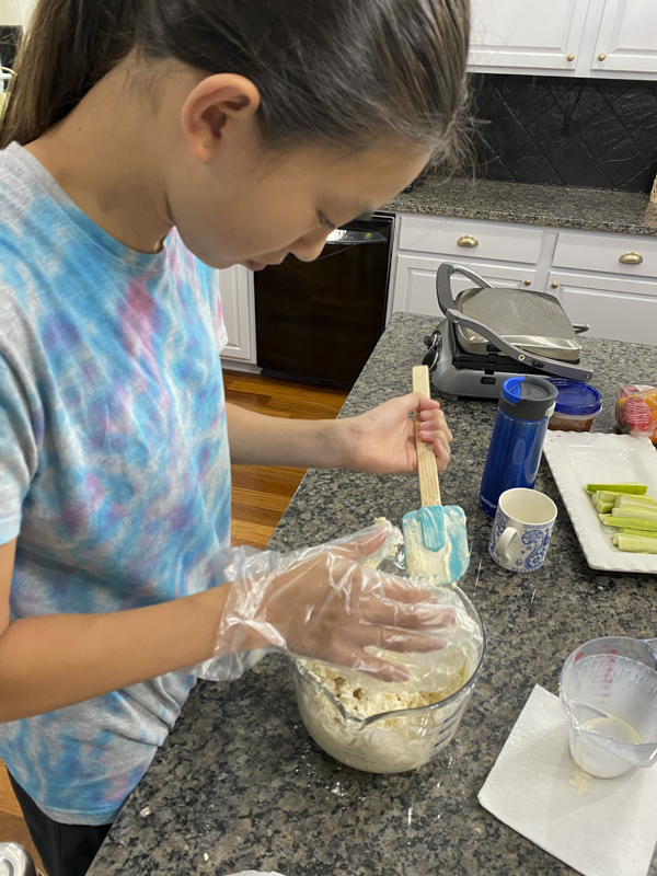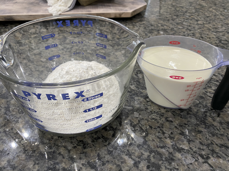 Heat oven to 450 degrees. Spray your pan or line it with parchment paper. Pour the flour in your large mixing bowl. Gradually stir in the heavy whipping cream and stir with a spatula. Keep adding and mix until it’s slightly sticky to touch.