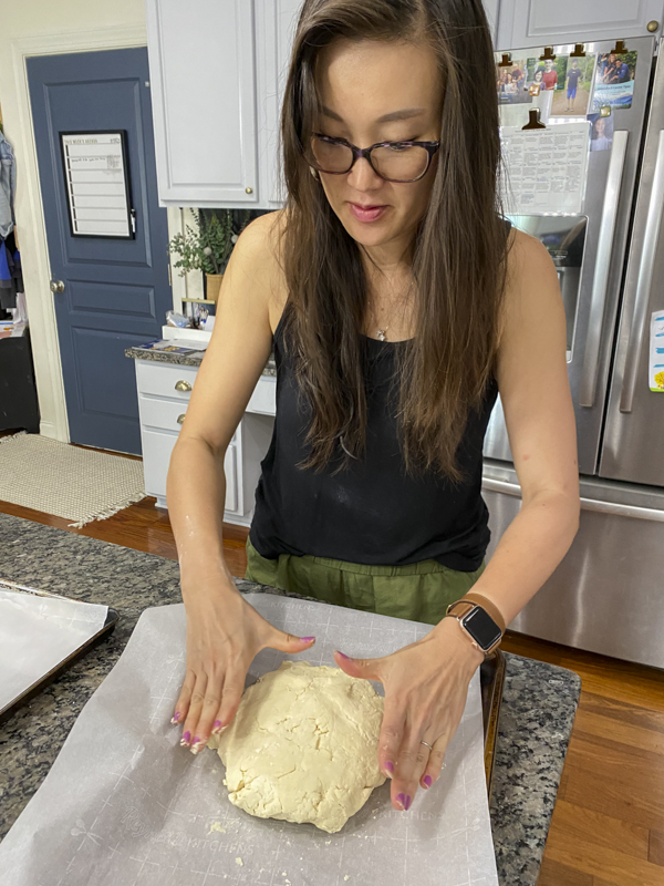 This is when I use my hands and pour it into my parchment paper. Add a little more flour if you need but I didn’t need any. Fold the dough a few times but not too much! Form it into a ball and then roll it out to about 1-2 inch thickness. I tried making them thin and thick and the thicker version is so much much better.
