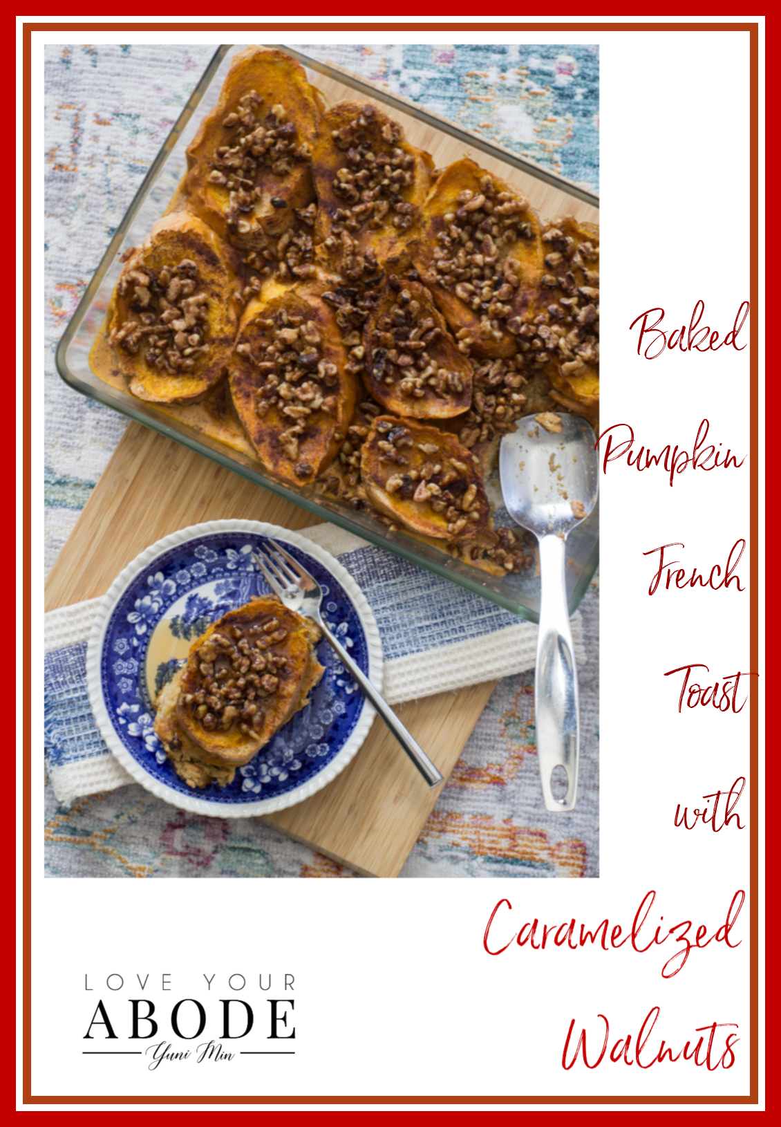 I’ve got the perfect holiday brunch idea for you! It’s this baked pumpkin French toast with caramelized walnuts.