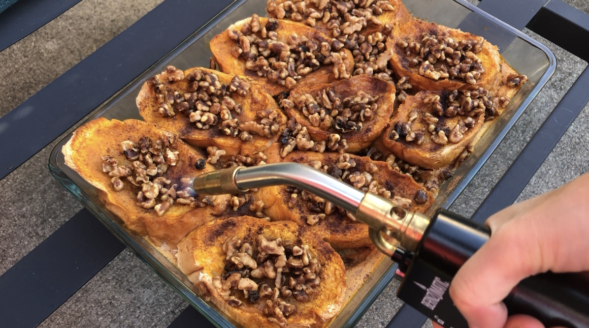 Need a delicious brunch idea this holiday? You got it! This baked pumpkin French toast with caramelized walnuts is exactly what you need to make for your family and friends. The best part of this recipe is that you can actually prepare it the night before and bake it the next morning. The other awesome part is that I got to use my Bernzomatic TS4000 torch to caramelize the walnuts on top for added flavor. Here’s how to make your own baked pumpkin French toast with caramelized walnuts.