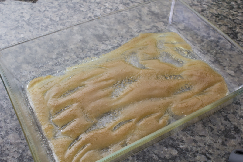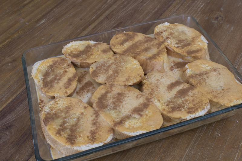Add your second layer of bread and finish spreading the brown sugar mixture on top. Pour the rest of the pumpkin mixture on top so that it covers all of the bread. Sprinkle some cinnamon on top.