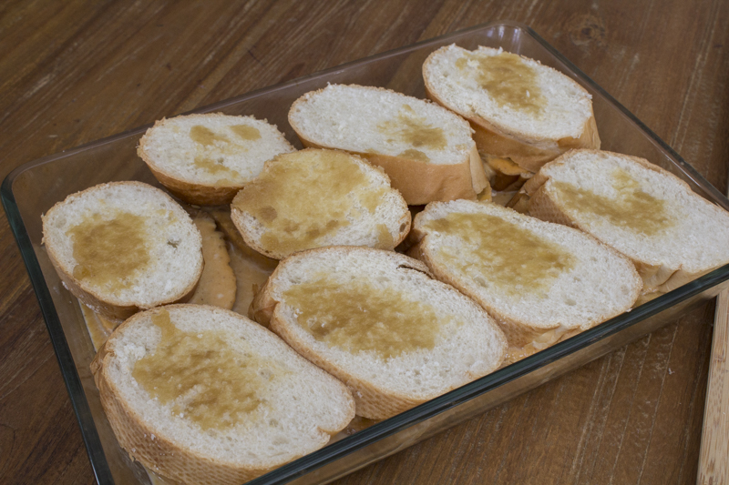 Preheat your oven to 350 degrees. Slice your French bread and put it aside. In one bowl, you will make your brown sugar mixture by adding the 1/2 cup of melted butter with the 1 cup of brown sugar. In another bowl mix the eggs, vanilla, cinnamon, pumpkin, milk and set aside.