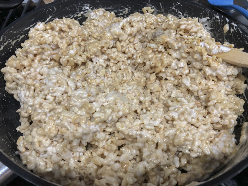 Step 5: Add the rice krispies and toss it around until it’s evenly coated.