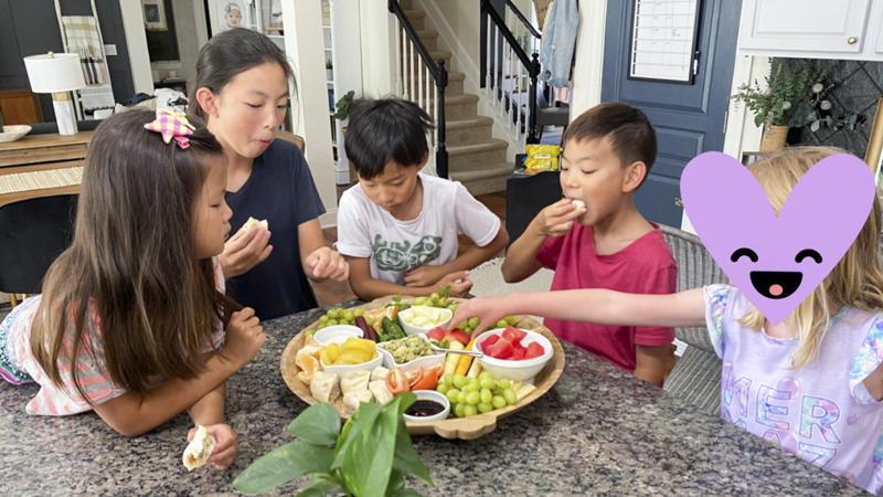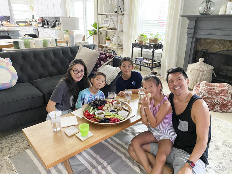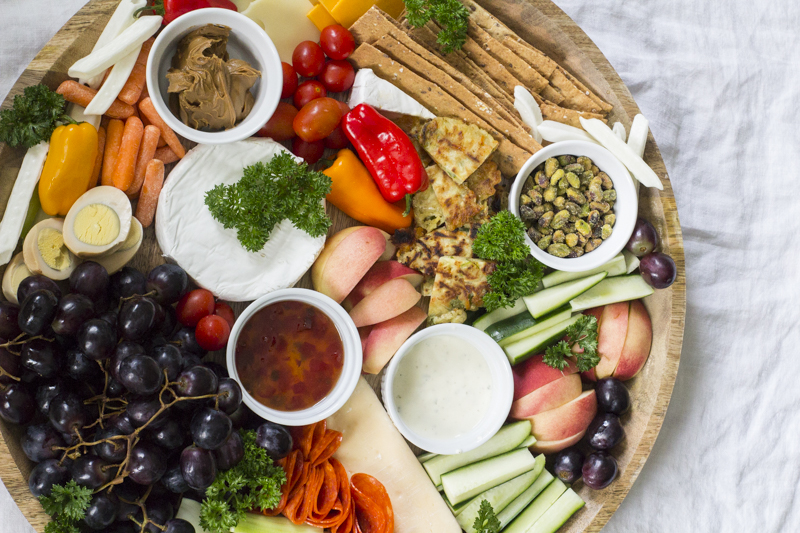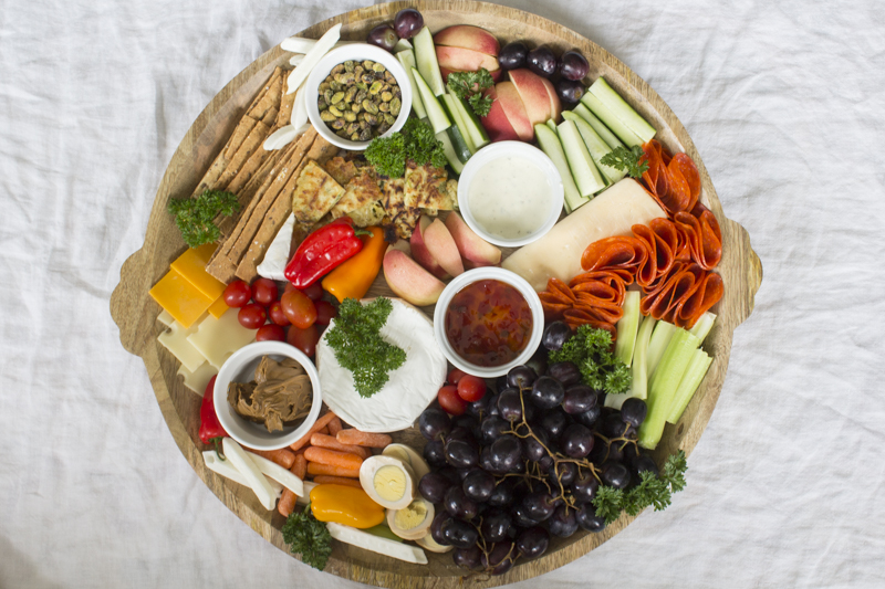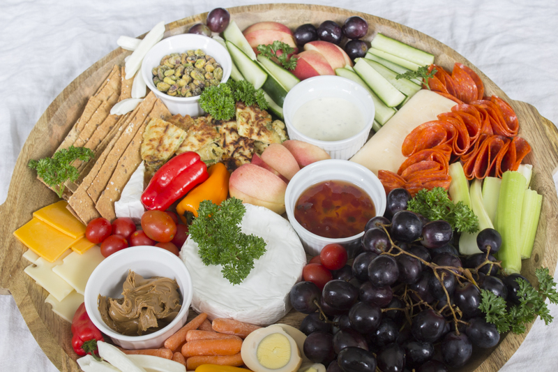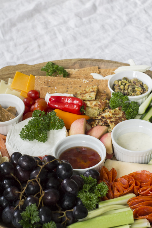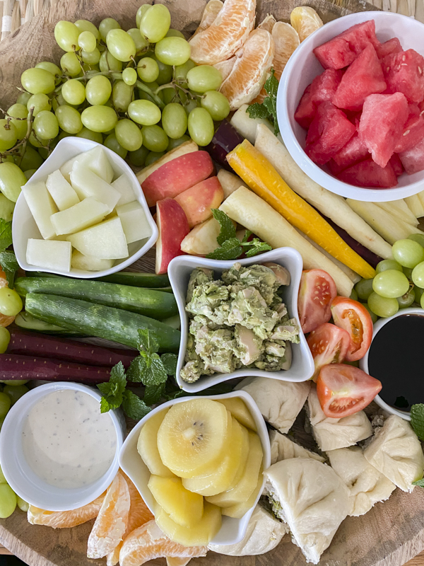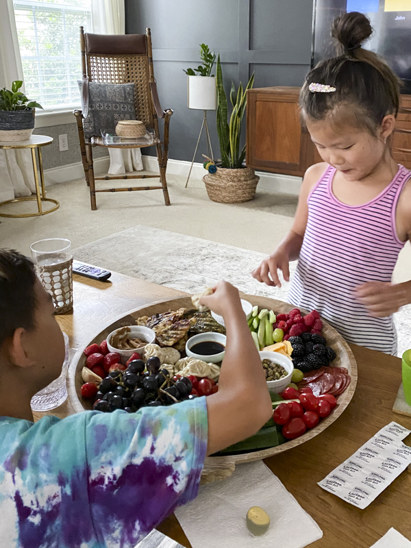 During the long summer months, I kept a much smaller and more simple veggie board out for a couple of hours. This helped the kids snack on vegetables and fruits as opposed to just walking to the pantry and grabbing chips or crackers. This makes me feel much better about our family’s heavy addiction to ice cream. 🙂