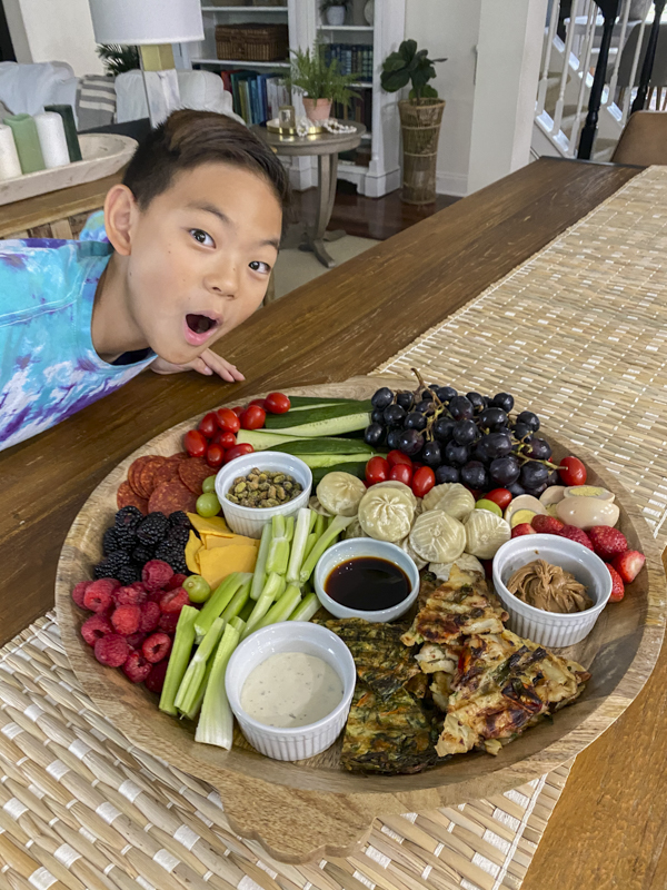 For each platter, we always make sure to add something Asian whether it be Korean pancakes, seaweed rolls, steamed buns, or a type of dumpling. I always add a variety of vegetables, fruits, cheeses, pepperoni, nuts, and crackers.