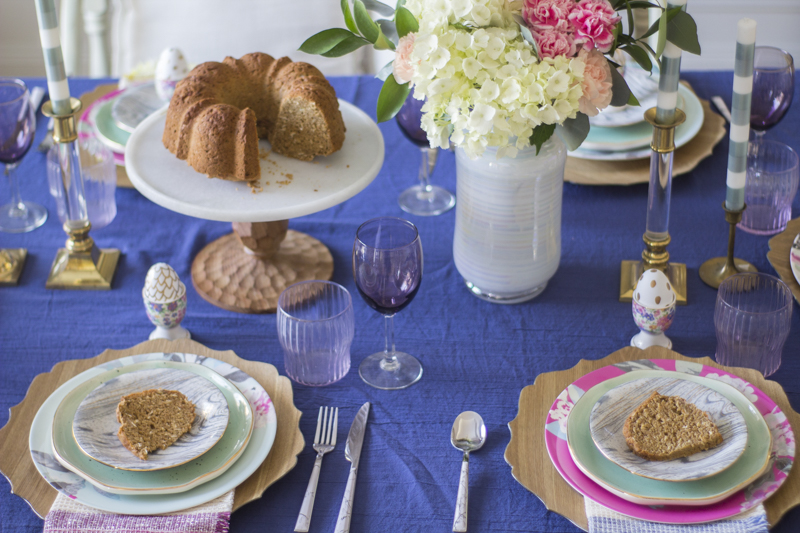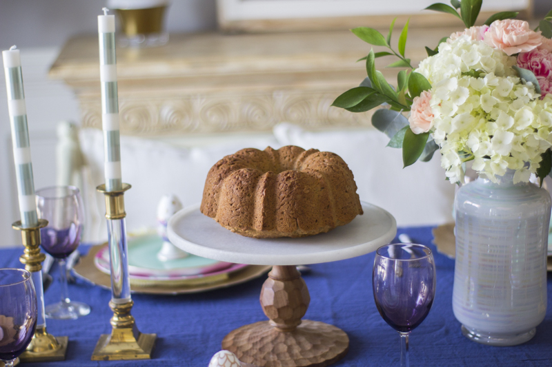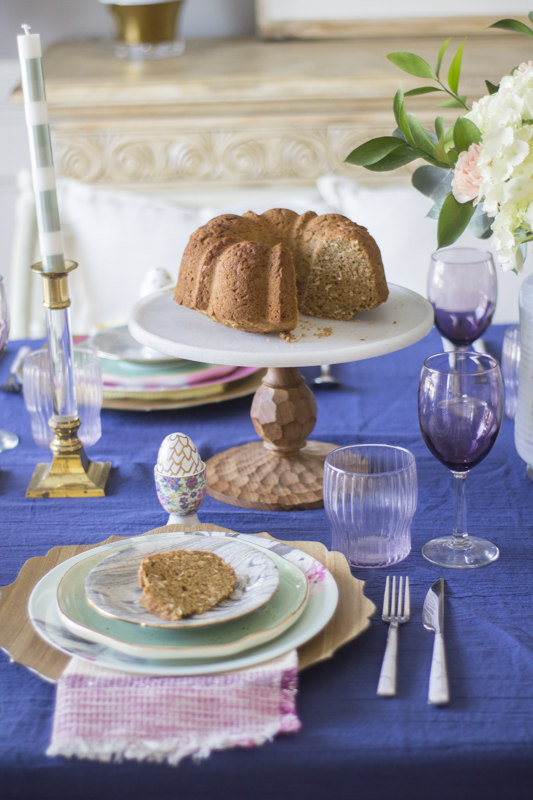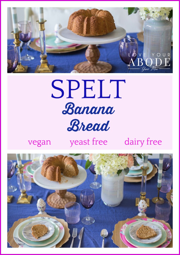 It’s perfect for Easter morning! I had to incorporate it into my Easter tablescape and snap some photos. This banana bread has a more dense consistency from your traditional banana bread recipe. It tastes so good toasted for breakfast with a cup of coffee or tea.